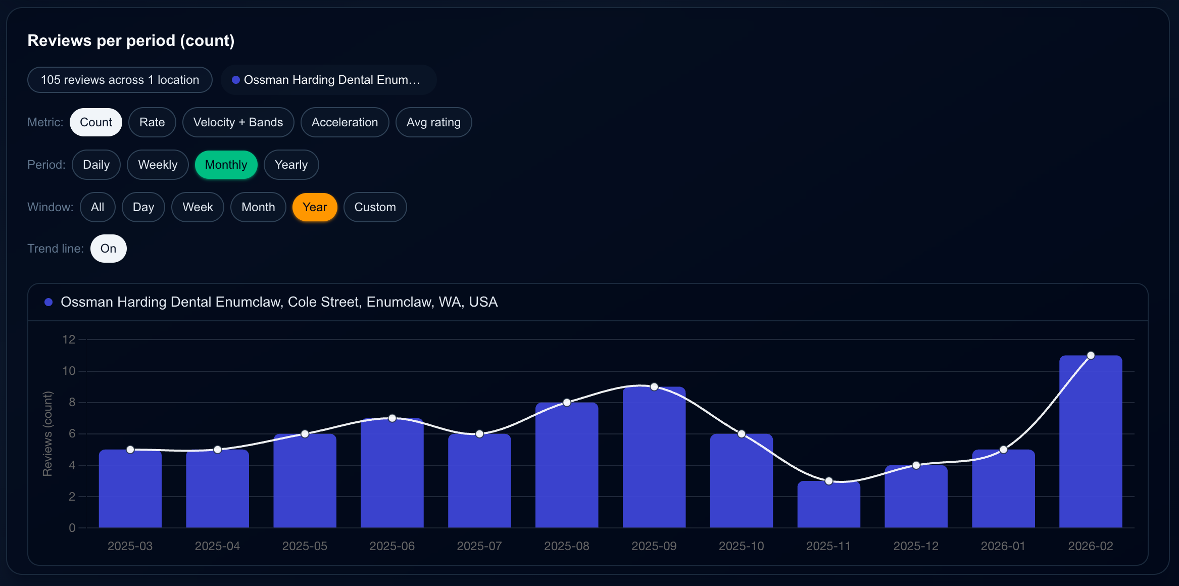 Bar chart of review count by day, week, month, or year. See how many reviews you received in each period, with an optional trend line to spot patterns.