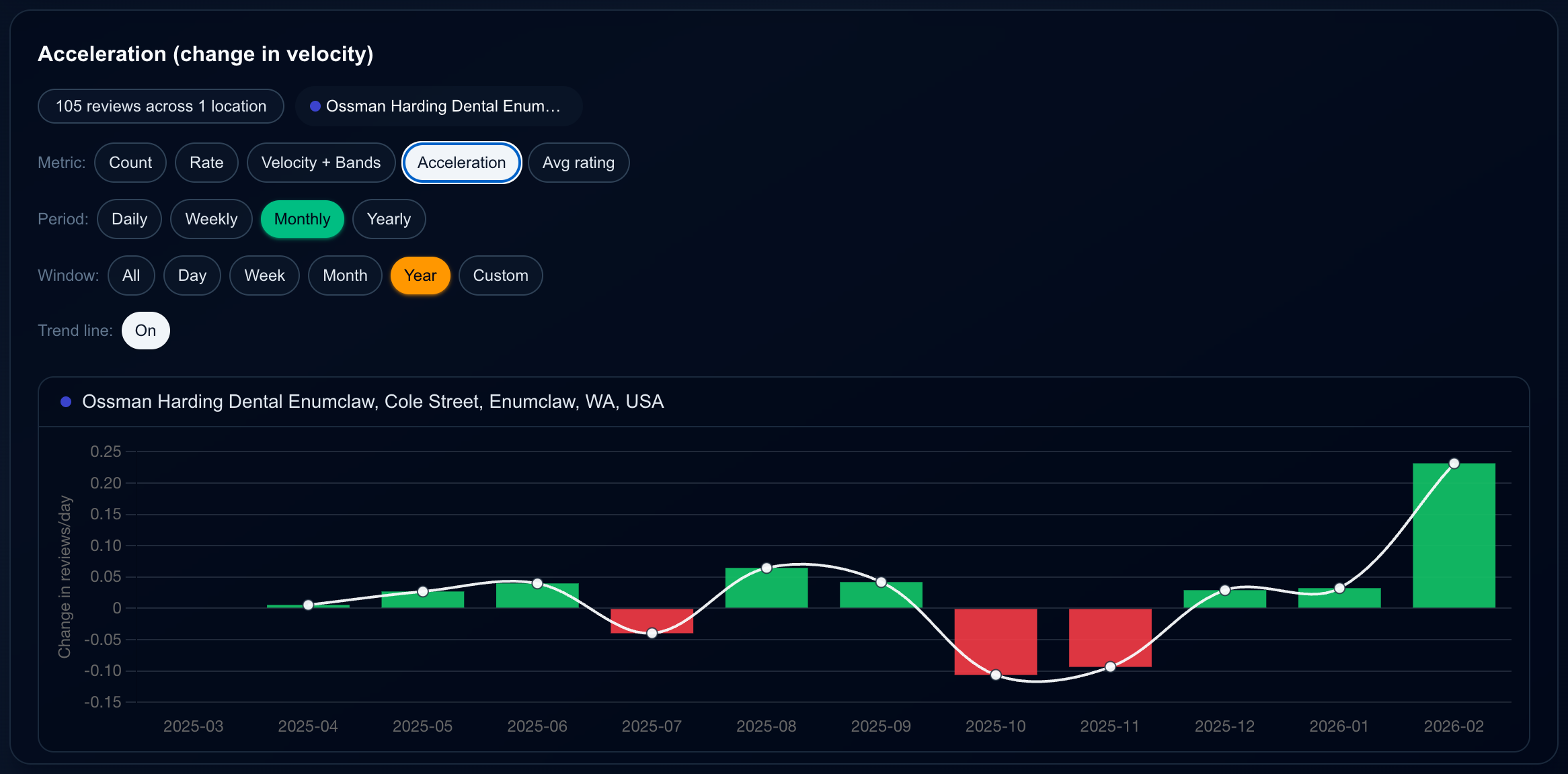 Month-over-month change in review velocity. Green bars show when growth is speeding up; red bars show when it’s slowing down.